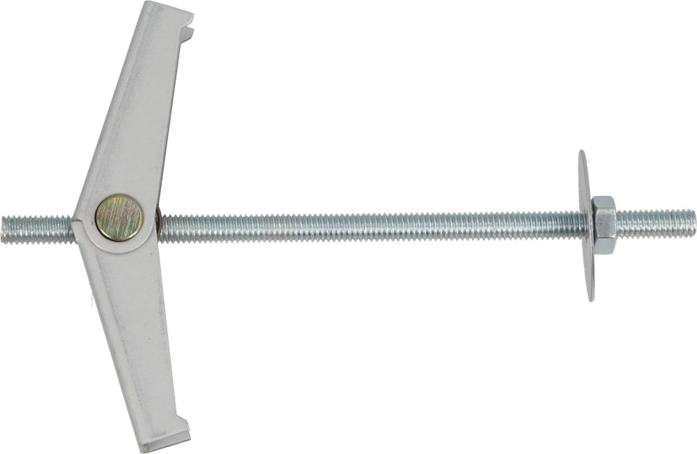 Deze verzinkte tuimelplug is geschikt voor holle wanden. De verende metalen pluggen hebben lange draadstangen waarmee ze grote wanddiktes overbruggen.