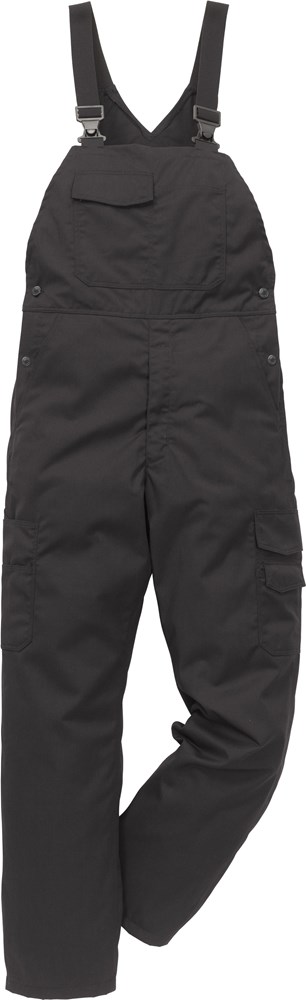 Twee zakken aan de voorzijde, twee zakken aan de achterzijde waarvan één met klep, twee borstzakken waarvan één met klep, beenzak met binnenzak voor duimstok in zijnaad en drie extrazakken en beenzak met klep en zak met klep voor mobiele telefoon aan de buitenzijde