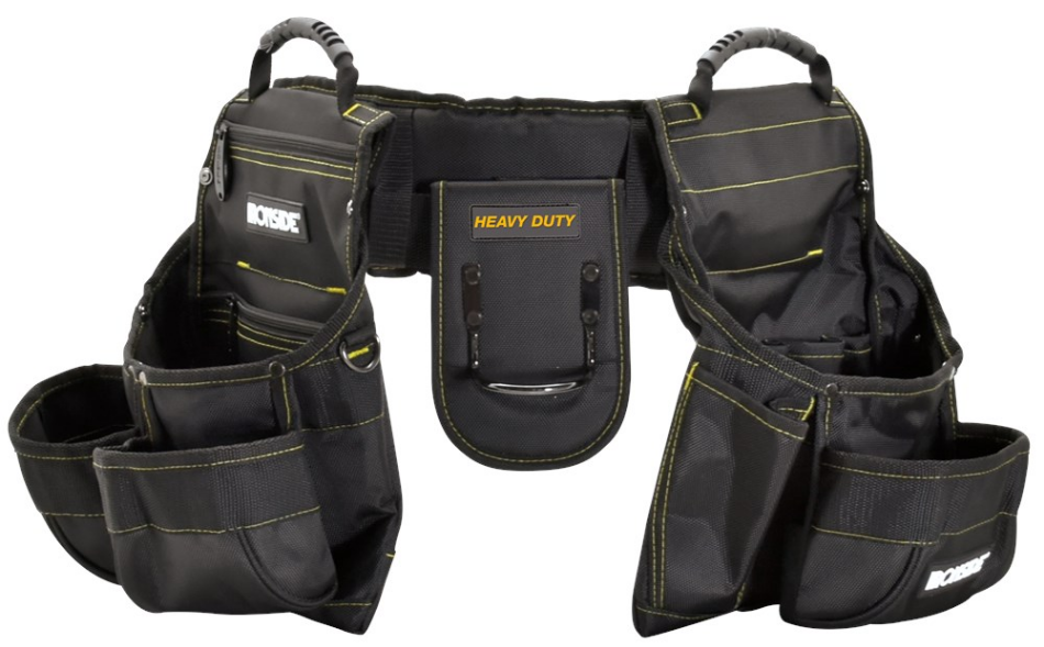 Gereedschapsgordel gemaakt van robuust 1680 Nylon dubbel gestikte zoom. Gewatteerde riem met rug support. Voorzien van handgrepen voor gemakkelijk transport. Steekresistent materiaal met geklonken naden. 1 Hamervak, 2 grote, verwijderbare zakken met handgreep. 5 grote zakken voor handgereedschap en nagels en 7 houders voor handgereedschap. Metalen rolbandmaat houder