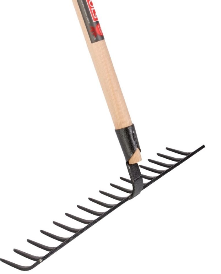Deze tuinhark is geschikt voor het verwijderen van tuinafval uit de borders en het egaal harken van grind. De keuze voor het aantal tanden is afhankelijk van wat voor oppervlakte er geharkt moet worden. De tuinhark is geproduceerd uit gesmeed staal wat sterker is dan verzinkt staal.
