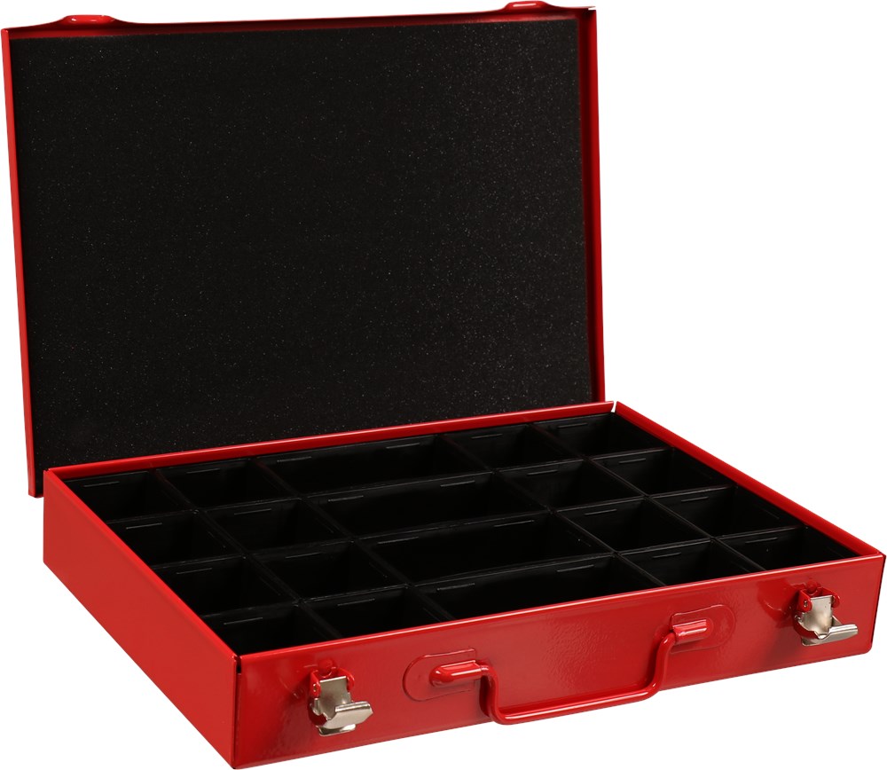 Metalen rood gelakte kist met twee sluitingen en losse kunststof inzetbakjes. 20 vaks.