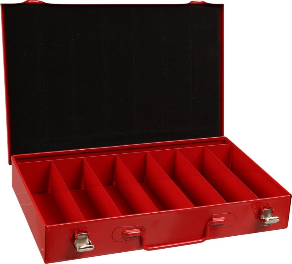 Metalen rood gelakte kist met twee sluitingen en 8 vakken. Afmeting 335x224x47 mm.