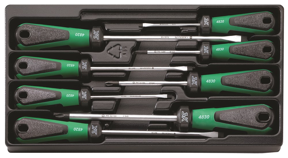 8-delig, 3-componenten greep, inhoud: 4820: 0,6 x 3,5 x 75 mm, 0,8 x 4,0 x 100 mm, 1,0 x 5,5 x 125 mm, 1,2 x 6,5 x 150 mm, 1,6 x 8,0 x 175 mm; 4830: gr. 1; gr. 2; gr. 3.