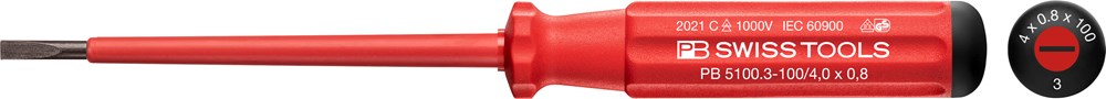 Classic VDE schroevendraaier voor gleufkop-schroeven. Volledig geïsoleerd tot 1000 V AC / 1500 V DC volgens IEC/EN 60900. VDE gekeurd, veilig werken tot 1000 V AC / 1500 V DC. Slank hecht, plaatsbesparend en ideaal voor fijn afstelwerk.