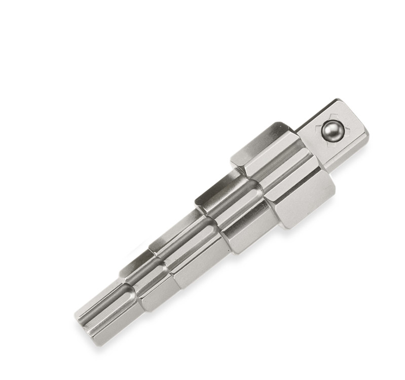Voor de in- en uitbouw van radiatorventielnippels, terugloopschroefkoppelingen en korte kraanverlengstukken. Chroom-vanadiumstaal, gehard, vernikkeld, aandrijfvierkant 1/2”.