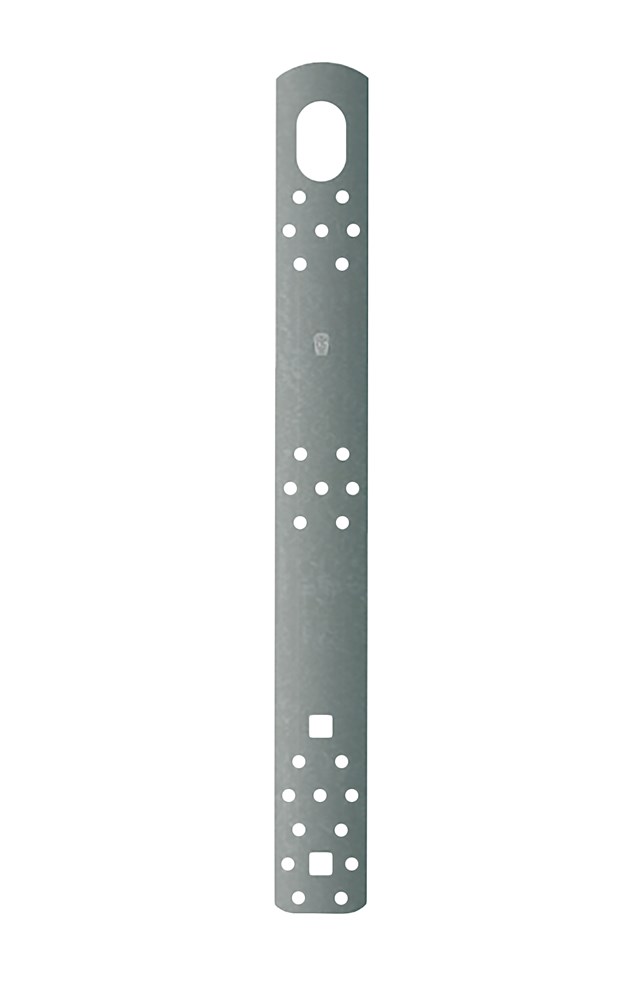 Metalen strip met een oog en schroefgaten, bedoeld als hijsvoorziening voor houten kozijnen, puien en elementen. Het hijsen dient plaats te vinden conform de richtlijnen van de SHR.
