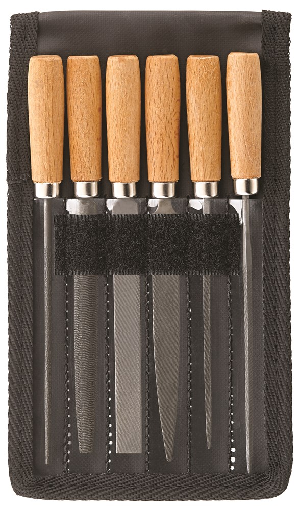 6-delig, in kunststoffen etui, DIN 7283. Inhoud: van elk 1 vijl in blok, vlakspits, halfrond, driekant, vierkant, rond.
