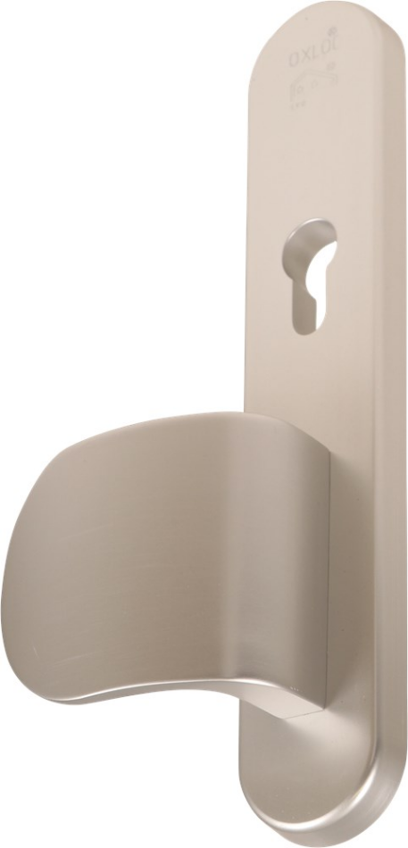 Ovaal model, aluminium geanodiseerd. Dikte buitenschild 12 mm en dikte binnenschild 8 mm. Afmeting schild 250x50 mm. Met deurduwer 90x80 mm en kruk. Geschikt voor seniorensloten. Met blinde bevestiging van binnenuit d.m.v. twee rvs metaalschroeven M6x53 mm.