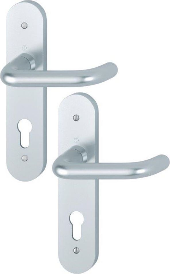 HOPPE afgerond binnendeurgarnituur, gegoten schilden met vast/draaibaar-gelagerde deurkrukken en krukveer-mechanisme en deurkrukken met massieve stift, zichtbare bevestiging, inclusief bevestigingsmateriaal.