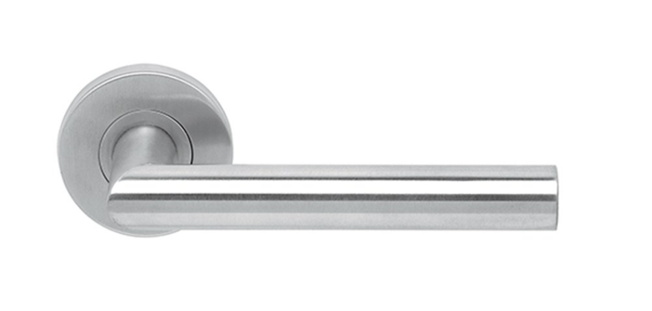 Paar deurkrukken vastgemonteerd met veer op rond rozet, met stalen onderconstructie