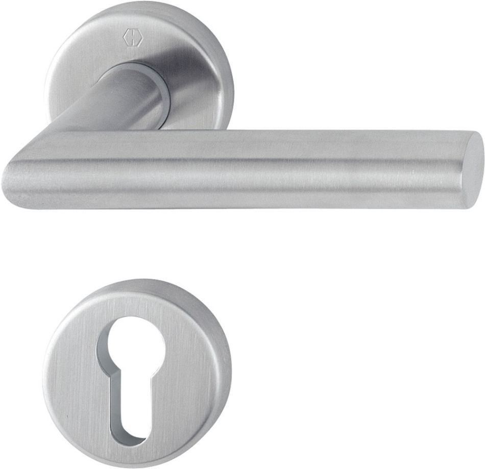 HOPPE roestvaststalen rozet-krukgarnituur met HOPPE-snelstiftverbinding, rozetten met kunststof onderconstructie, krukveer en steunnokken, onzichtbare, doorgaande bevestiging met zelfsnijdende schroeven.