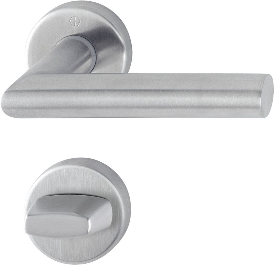 HOPPE roestvaststalen rozet-krukgarnituur met HOPPE-snelstiftverbinding, rozetten met kunststof onderconstructie, krukveer en steunnokken, onzichtbare, doorgaande bevestiging met zelfsnijdende schroeven.