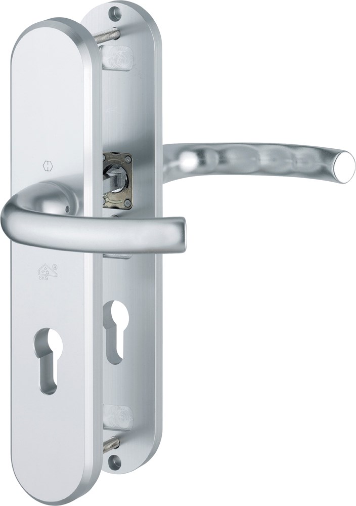 Aluminium afgerond inbraakwerend deurkrukgarnituur van massief aluminium, met rondom facet, conform NEN 5089, SKG®***-keurmerk. Buitenzijde met deurkruk met HOPPE-snelstiftverbinding en stalen nokken. Binnenzijde voorzien van hooghoudveer en met zichtbare bevestiging met 3 x M6 kruiskop Bouten en deurkruk-gatdeel.