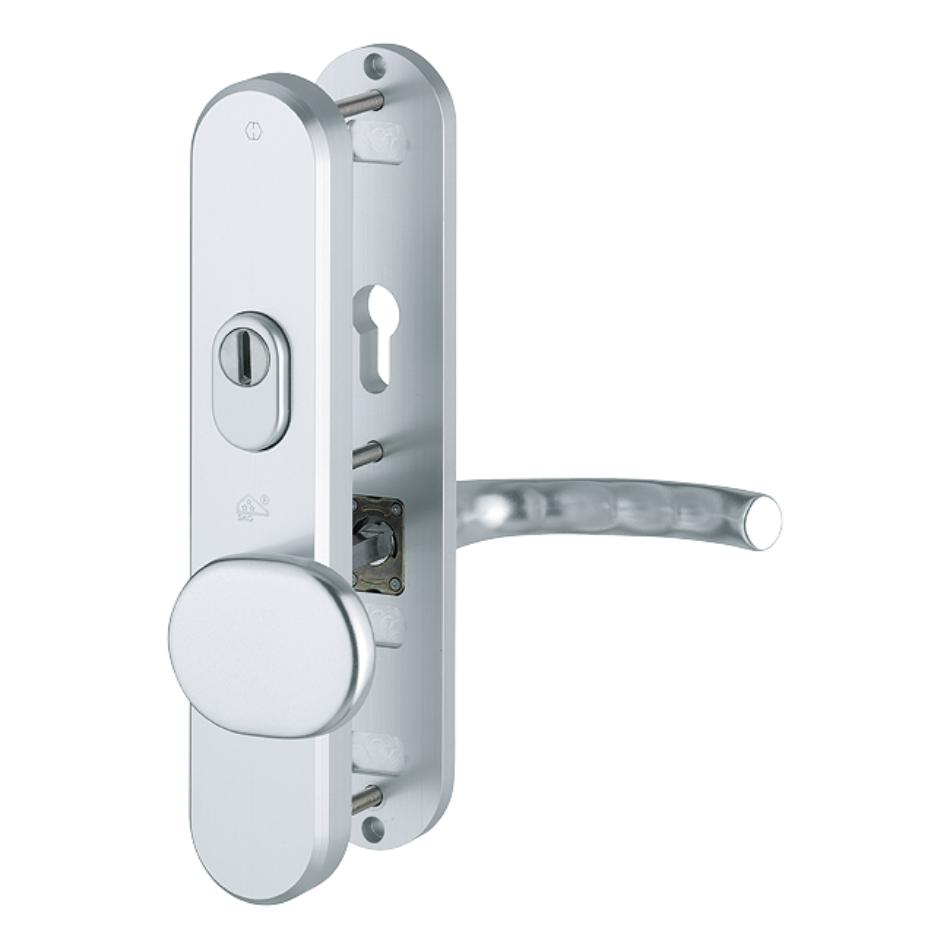 Aluminium afgerond inbraakwerend voordeurgarnituur van massief aluminium voor comfortsloten, met rondom facet, conform DIN 18257 en NEN 5089, SKG®***-keurmerk. Buitenzijde met cilinder-kerntrekbeveiliging, verkropte vaste knop, met HOPPE-snelstiftverbinding (met HOPPE-FDW-volstift) en stalen nokken. Binnenzijde voorzien van hooghoudveer en met zichtbare bevestiging met 3 x M6 kruiskop Bouten en deurkruk-gatdeel.