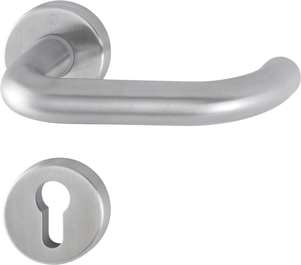 HOPPE roestvaststalen rozet-krukgarnituur met HOPPE-snelstiftverbinding, rozetten met kunststof onderconstructie, krukveer en steunnokken, onzichtbare, doorgaande bevestiging met zelfsnijdende schroeven.