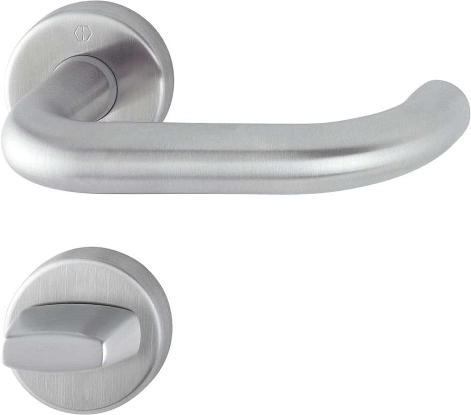 HOPPE roestvaststalen rozet-krukgarnituur met HOPPE-snelstiftverbinding, rozetten met kunststof onderconstructie, krukveer en steunnokken, onzichtbare, doorgaande bevestiging met zelfsnijdende schroeven.