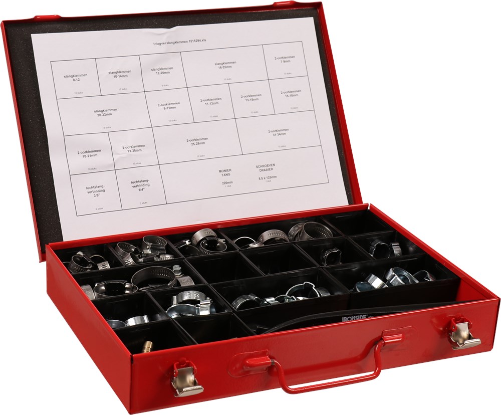 Metalen, rood gelakte kist met twee sluitingen en losse kunststof inzetbakjes.