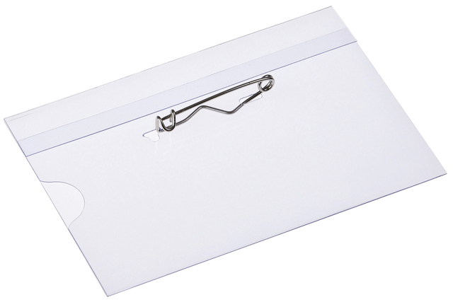 Badge gemaakt van helder transparant PVC. Met duimgreep voor het gemakkelijk insteken van het naamkaartje. Voorzien van een speld waarvan de punt is beschermd. Afmeting insteekkaartje Breedte x Hoogte 92x58mm. Doosje met 24 badges en losse insteekkaartjes.