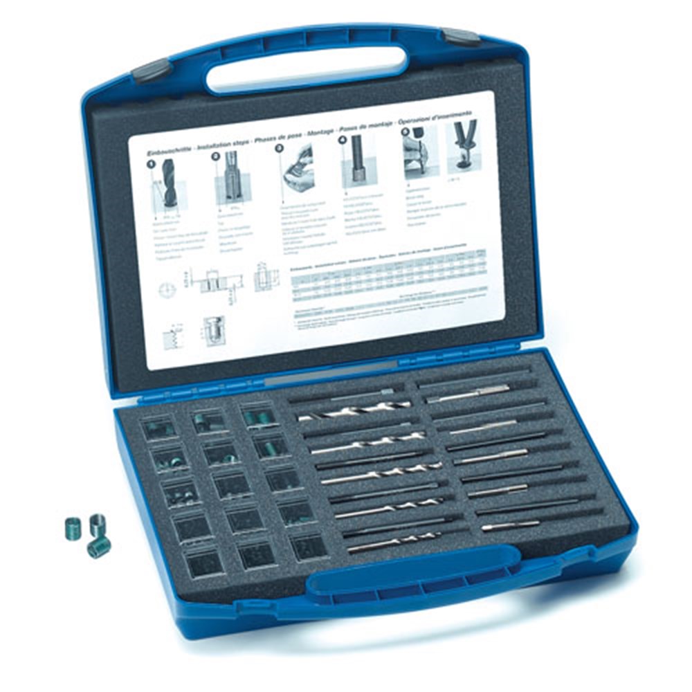 Inhoud:- HeliCoil® Plus schroefdraadelementen in verschillende afmetingen (de schroefdraadelement lengte van elke maat is 1 x d, 1,5 x d en 2 x d) handtappen indraaispillen drevels