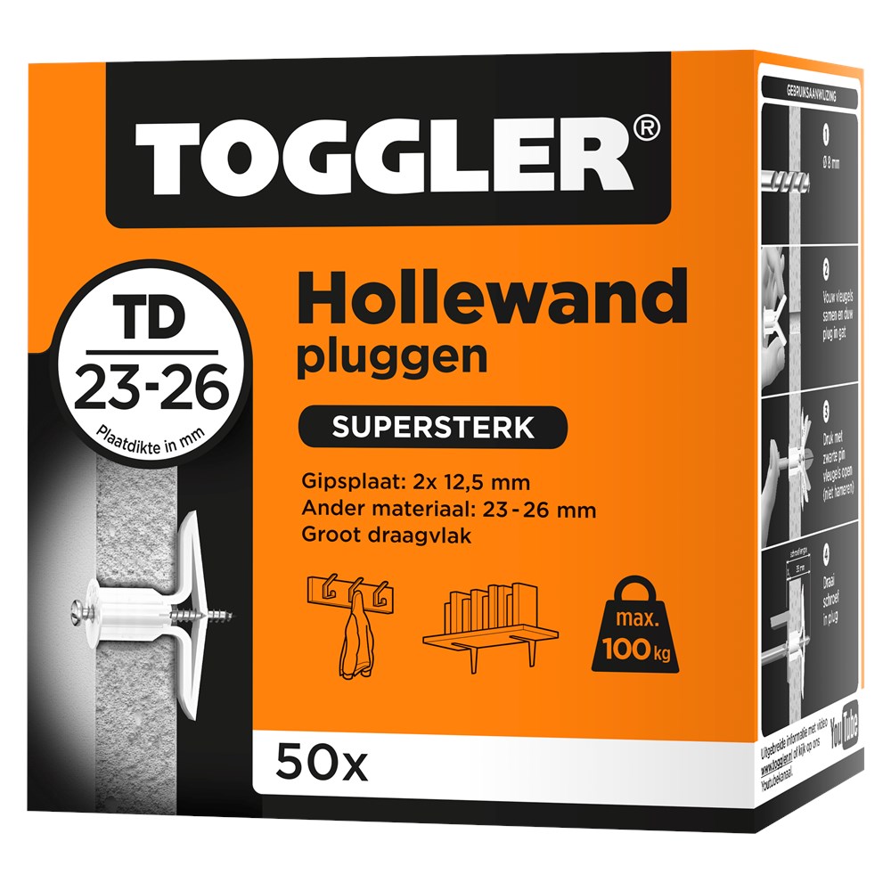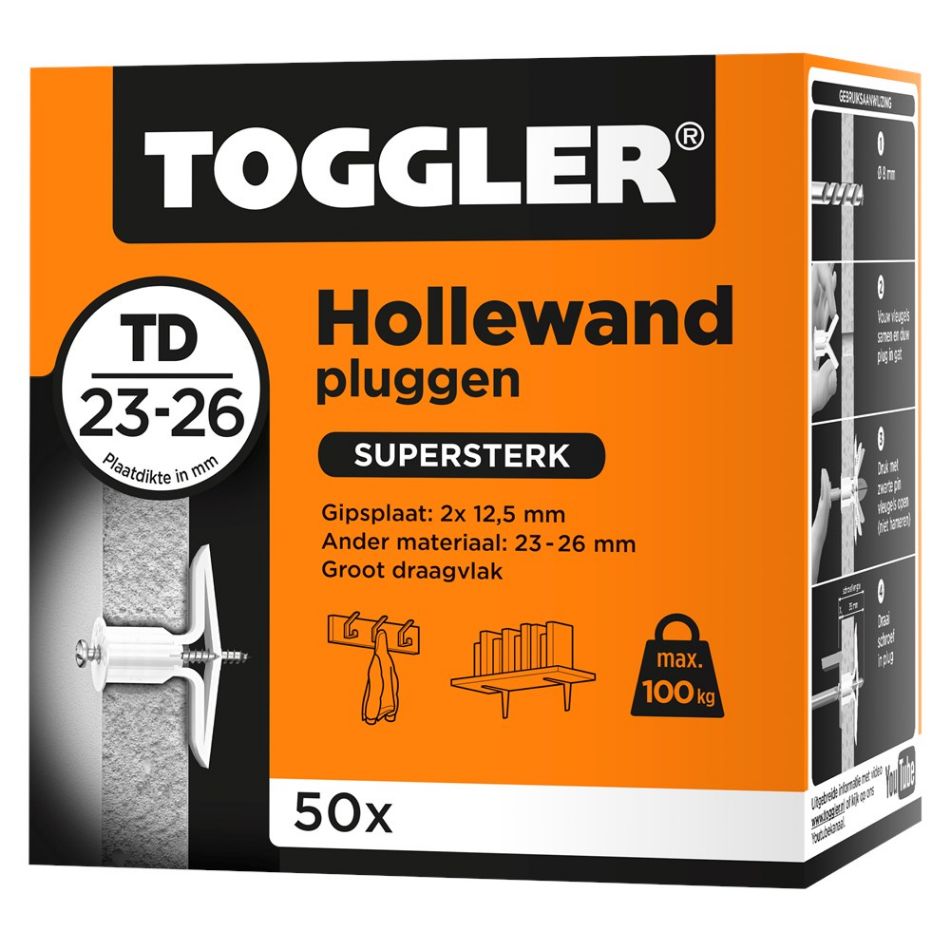 De Toggler Hollewandplug TD is de ideale oplossing voor holle wanden van 23 - 26mm zoals dubbele gipsplaat.
