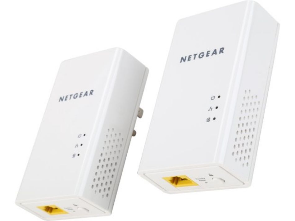 Netgear PL1200, Powerline 1200 adapter kit, 2 Powerline 1200 adapters voor de transmissie van ethernet via het spanningsnet, 1200 Mbps op 1 poort. Meerdere adapters kunnen gebruikt worden om het bekabelde netwerk uit te breiden, eenvoudige installatie, eenvoudige encryptie via één enkele druk op een knop, 2 ethernet kabels van 2 meter zijn standaard meegeleverd, afmetingen van de adapter: 100 x 56 x 30 mm, 1 RJ45-poort 10/100/1000 Mbps.