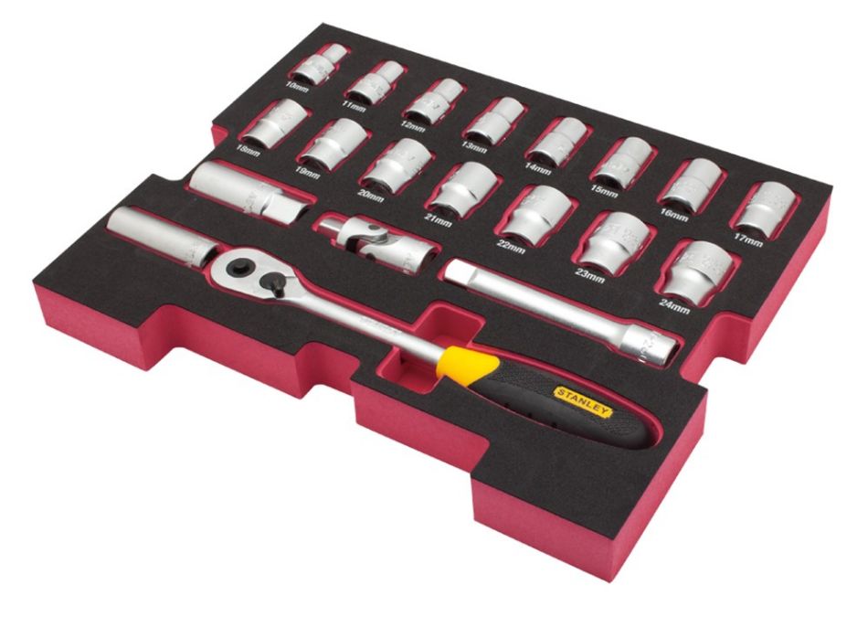 Deze Stanley FatMax Tstak insert 20-delige doppenset 1/2" met foam inlay omvat: