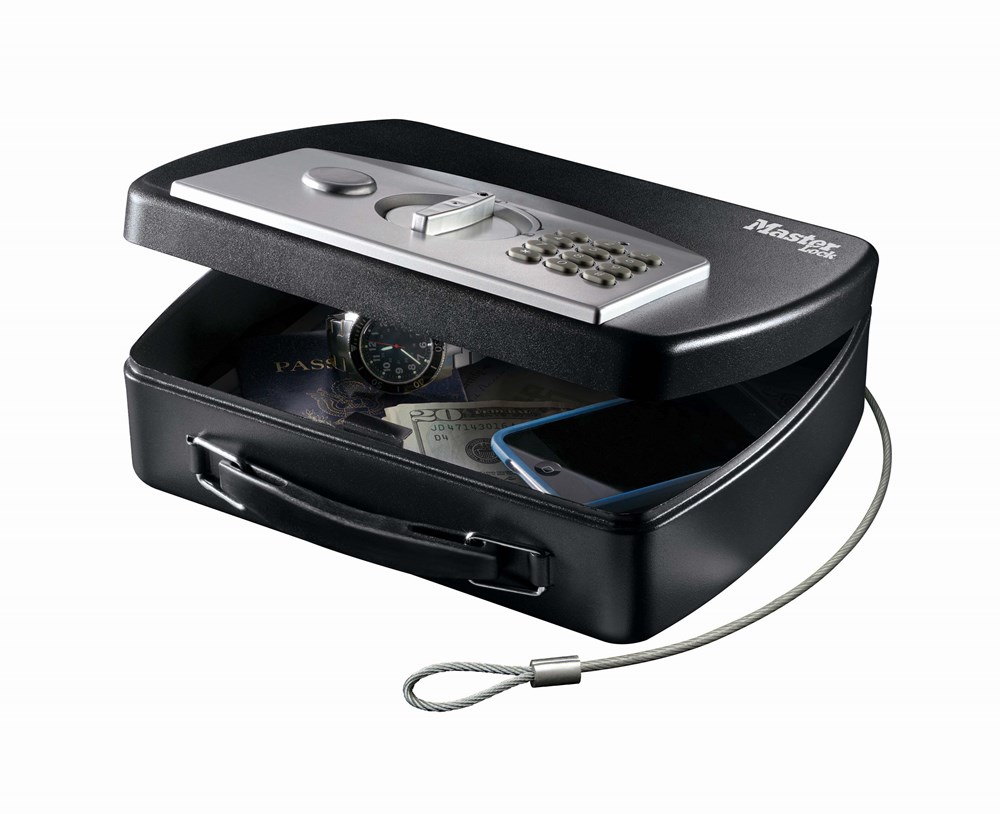 Compacte autokluis met kabel van MasterLock. Ideaal voor het beveiligen van waardevolle spullen (geld, sieraden, cameraÆs, etc.) voor b.v. onderweg voor in de auto. Kleine kluis met digitale combinatie - staalconstructie (2,2 liter). De kluis is voorzien van een stalen kabel voor het bevestigen van de kluis aan een geaard object. Mogelijkheid om 2 verschillende codes in te voeren voor extra beveiliging. Rustige toegang met compressie gasveer. Inclusief 2 noodsleutels, nuttig in geval dat de code wordt vergeten. Bodem van de doos is bedekt met schuim tegen krassen. Werkt met 4 AA alkaline batterijen (niet inbegrepen).