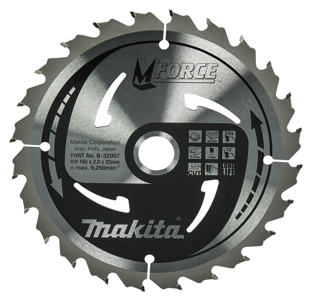 Makita heeft een uitgebreid assortiment cirkelzaagbladen voor de diverse machines. Kies een zaagblad voor het te zagen materiaal en passend op de te gebruiken machine; er zijn verschillende kwaliteiten, waarbij de Makita Efficut zaagbladen tot het top segment behoren. Voor meer informatie omtrent cirkelzaagbladen zie het Makita kenniscentrum: https://www.makita.nl/kenniscentrum/cirkelzaagbladen-en-de-technieken-erachter.html Nieuwe generatie Mforce cirkelzaagblad met vernieuwd tanddesign. Uitermate geschikt voor: zachthout/overlangs en afkorten, geplastificeerd en gefineerd hout, meubelplaat, hardhout/overlangs en afkorten. Geschikt voor: zachthout/fijn afkorten, OSB, duplex-, triplex- en multiplexhout. De tanden zijn voorzien van een dubbele snijhoek van 15 graden wat een agressieve en snelle zaagsnede garandeert. De M-vormige, dubbelsnijdende tand zorgt ervoor dat een afwerking van een 48-tands blad wordt bereikt met een 24-tands blad.