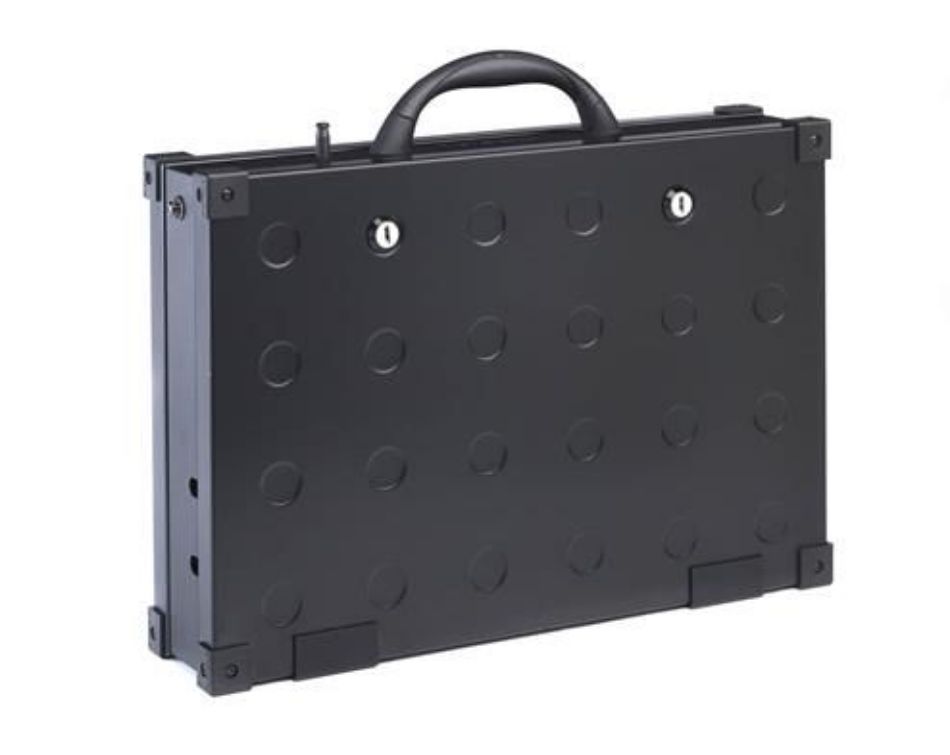 De lichtgewicht aluminium koffer met twee hoogwaardige veiligheidssloten is moeilijk open te krijgen. Door de Steelbag® met een ijzersterke, 10mm dikke kabel (optioneel) aan een vast punt te bevestigen wordt voorkomen dat de koffer in zijn geheel wordt meegenomen. Dit zorgt ervoor dat de koffer veilig opgeborgen kan worden. De koffer wordt geleverd inclusief schouderriem.