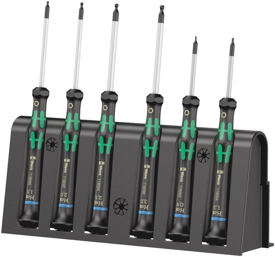 Hoogwaardige Wera Micro-schroevendraaierset voor fijnmechanische schroefwerkzaamheden. Kogelkopprofiel: Dankzij de kogelvormige aandrijfprofielen is het mogelijk om de gereedschapsas t.o.v. de hartlijn van de schroef naar buiten te verleggen of te zwenken, waardoor het ook mogelijk wordt om 'om de hoek' te schroeven. Door afsteunen van de hand op de draaikap en de sneldraaizone onder de draaikap is razendsnel heen-en-weer draaien mogelijk. Tijdrovend ompakken behoort tot het verleden. Krachtzone met geïntegreerde zachte delen zorgt voor overdracht van hoge losdraai- en aanhaalmomenten. Precisiezone voor de juiste draaihoek bij afstelwerkzaamheden. De Wera Black Point-punt biedt een hoge pasnauwkeurigheid en extra bescherming tegen corrosie.