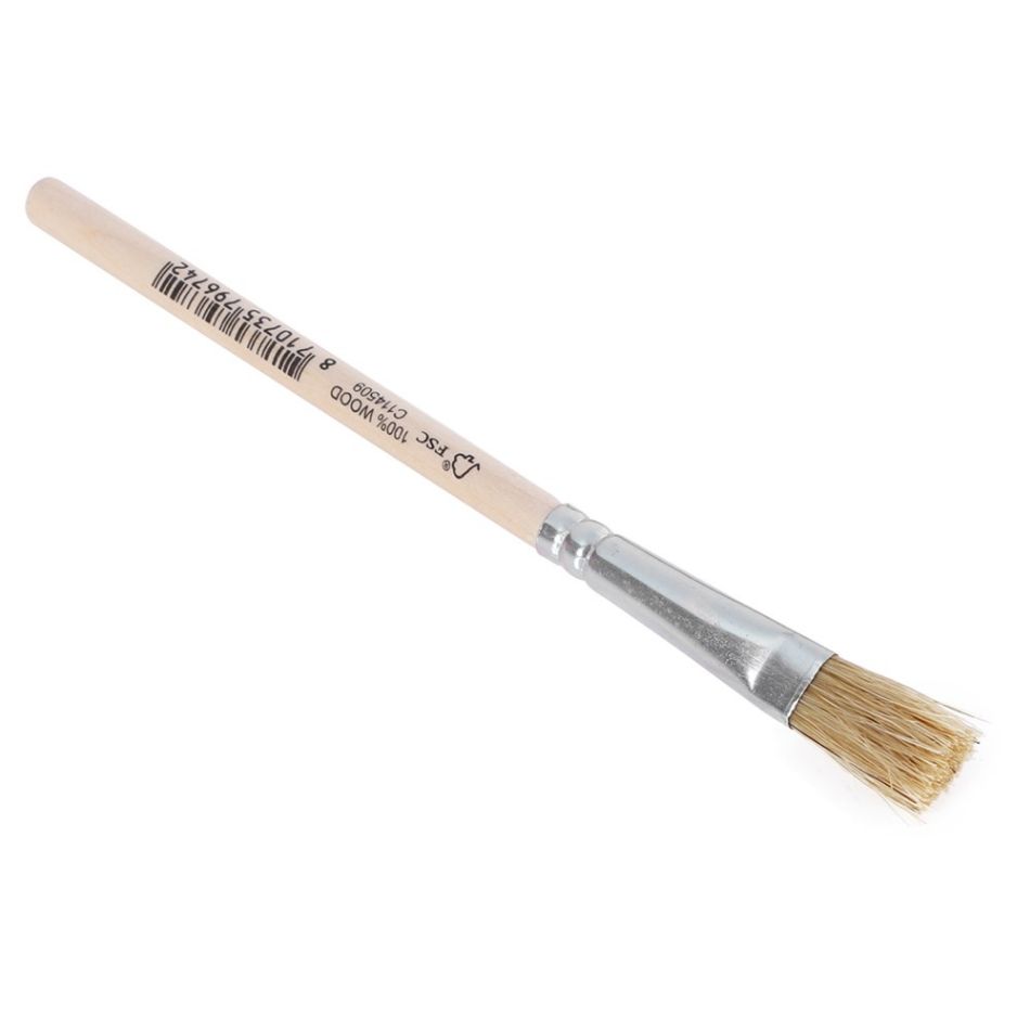 Gompenseel Kort model met kunststof steel voorzien van een nikkelen bus. De haren zijn vervaardigd van wit Chinees varkenshaar. Deze penseel is geschikt als lijm- of kleefkwast.
