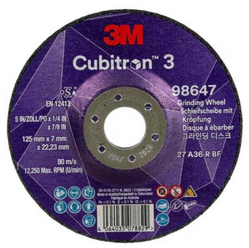 De 3M Cubitron 3 slijpschijf met verlaagd asgat is een uitzonderlijk snel snijdende, stijfgebonden schijf met een lange levensduur voor het verwijderen