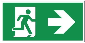 Dit nooduitgang bord laat zien dat de nooduitgang kan worden gevonden wanneer men naar rechts loopt. Op die manier zorgt u ervoor dat mensen in een noodsituatie precies weten waar de nooduitgang is.