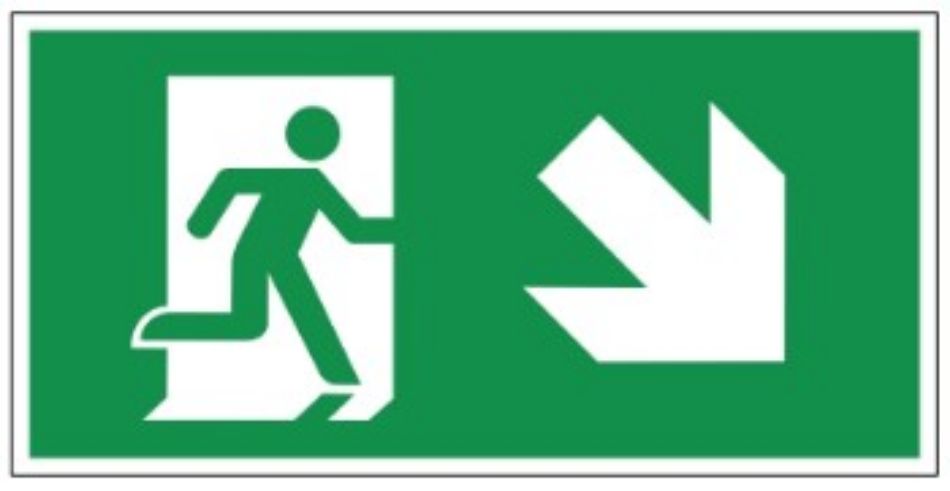 Dit nooduitgang bord laat zien dat de nooduitgang kan worden gevonden wanneer men rechts naar beneden loopt. Op die manier zorgt u ervoor dat mensen in een noodsituatie precies weten waar de nooduitgang is.