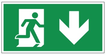 Dit nooduitgang bord laat zien dat de nooduitgang kan worden gevonden wanneer men naar beneden loopt. Op die manier zorgt u ervoor dat mensen in een noodsituatie precies weten waar de nooduitgang is.