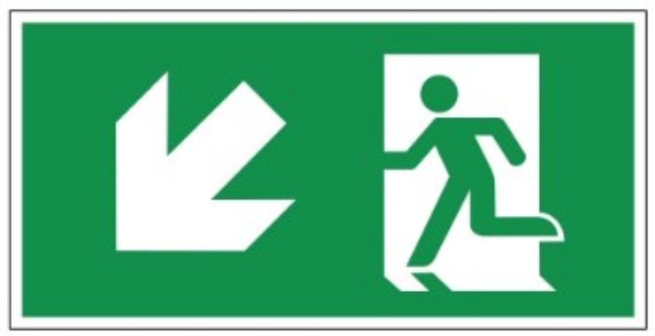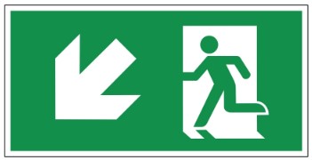 Dit nooduitgang bord laat zien dat de nooduitgang kan worden gevonden wanneer men links naar beneden loopt. Op die manier zorgt u ervoor dat mensen in een noodsituatie precies weten waar de nooduitgang is.
