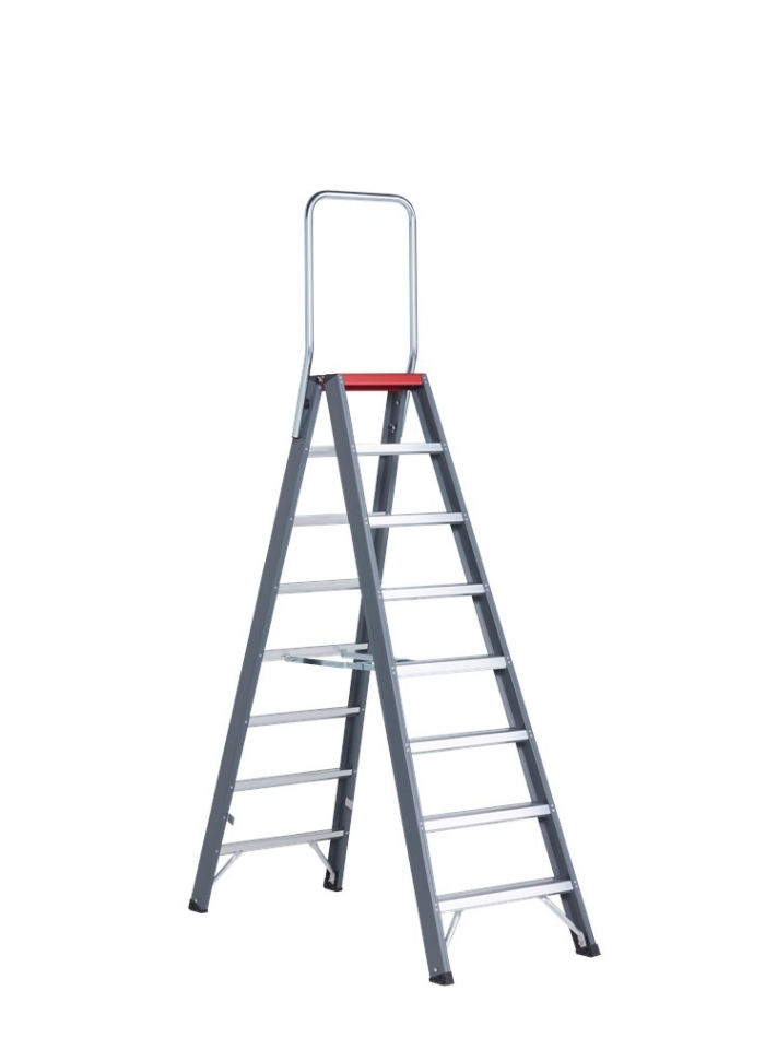 De Falco is gemaakt voor intensief gebruik. Dubbel oploopbaar dus aan beide zijden te gebruiken. De robuust vormgegeven trap is ideaal voor elke professionele klus. Het unieke scharniersysteem van het bordes maakt de trap opvallend veilig in gebruik.