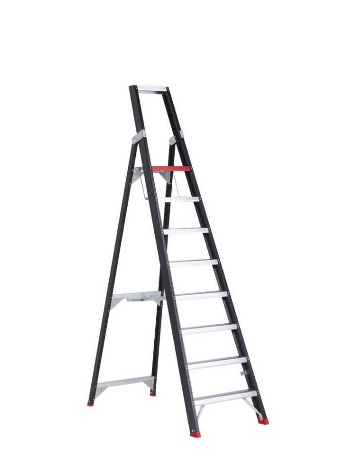 Extra bijzonder zijn de twee bordessen boven elkaar. Daarmee beschik je over twee veilige en comfortabele werkplekken. Door de drukvaste spreidbeveiliging weet je zeker dat de trap niet ongewild inklapt. Bovendien sta je stevig en stabiel door de grote antislip-voeten en de omsloten scharnieren. Een trap op het hoogste niveau.