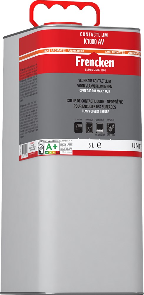 Contactlijm K1000 AV is geschikt voor vlakverlijming van hardkunststofplaat (duropal, formica, print hpl, resopal, e.d.) en fineer onderling of op spaanplaat, triplex, hardboard multiplex, MDF en ander plaatmateriaal. Ook voor verlijming van rubber, kurk, leer, karton, bekledingsmaterialen, flexibele schuimen onderling of op spaanplaat, multiplex, beton, steen, marmer, metalen, aluminium en rvs. Niet toepassen voor de verlijming van polystyreen plaat- en schuimproducten als piepschuim bijvoorbeeld styropor, depron, styrodur. gebruik hiervoor Frencken Elastische contactlijm.