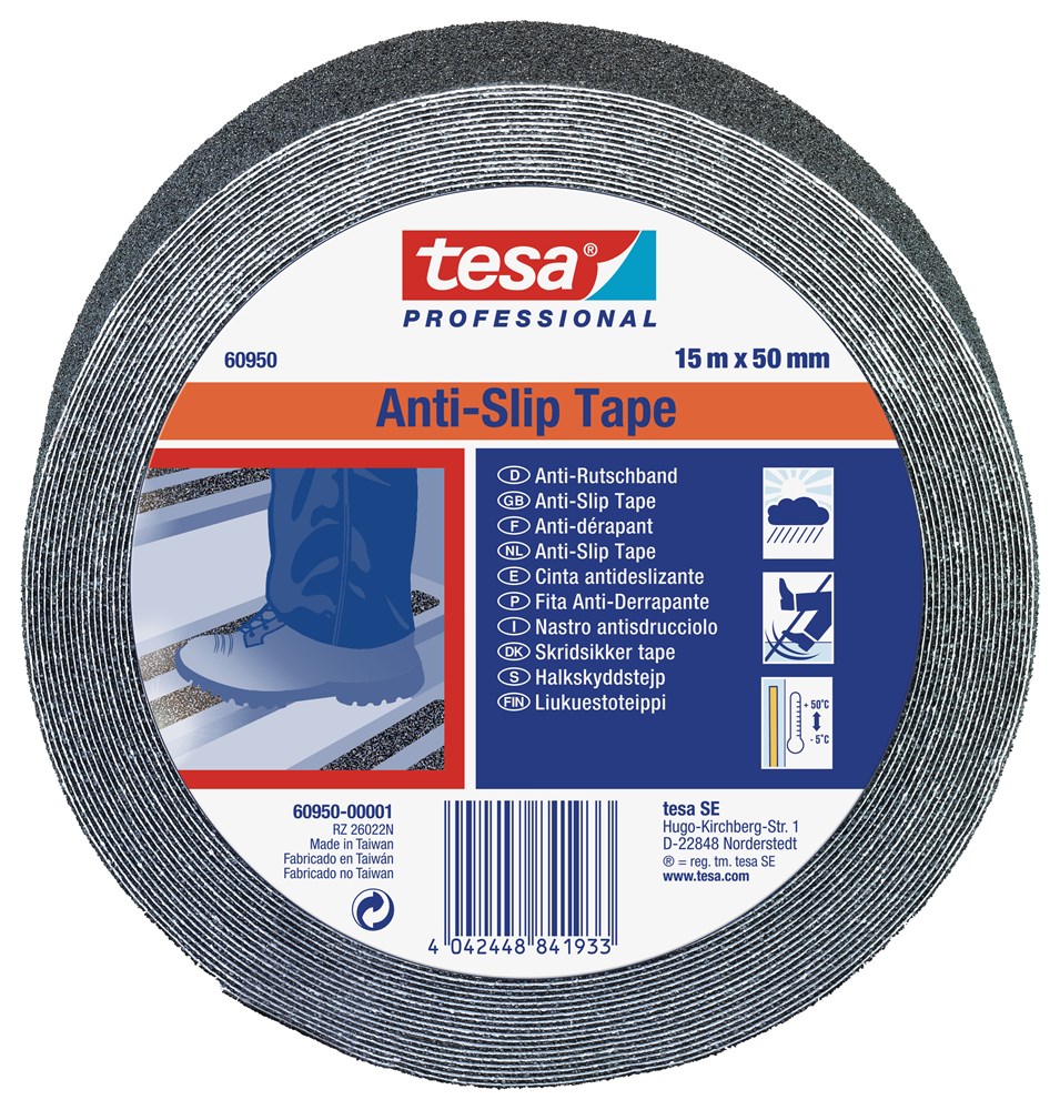 De tesa® 60950 anti-sliptape wordt zowel binnen als buiten gebruikt en zorgt voor een stevige grip in zones waar veiligheid voorop staat. De combinatie van een PVC-substraat met een aluminiumoxide coating en een acrylaatkleefstof geeft een anti-slipeffect dat tot twee jaar duurt. De tesa® 60950 anti-sliptape gecertificeerd volgens DIN 51130 norm en onderscheidt zich door zijn bestendigheid tegen zout water en chemicaliën, en dat hij met de hand afgescheurd en zonder moeite verwijderd kan worden.