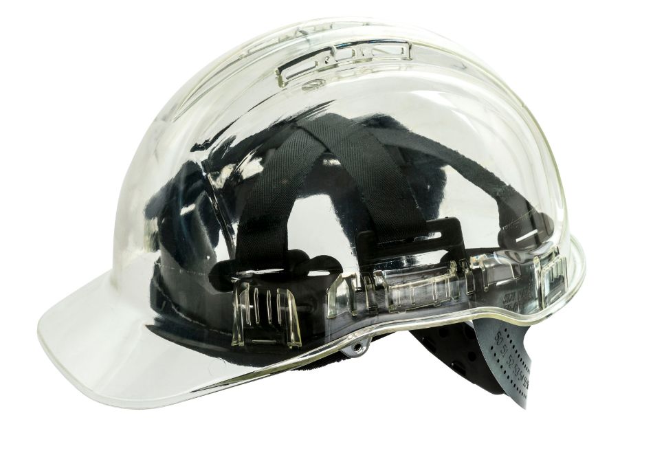 Een exclusief door portwest ontworpen en gepatenteerd ontwerp. Transparante helm om door de klep en de zijden heen te kijken: het geeft de drager de mogelijkheid omhoog te kijken zonder de helm op te hoeven tillen of het hoofd in de nek te hoeven leggen. Extra sterk en toch zeer licht van gewicht polycarbonaat schelp, met UV bescherming, 6 punts binnenwerk, verstelbare maat. Geventileerd voor extra luchtstroom.