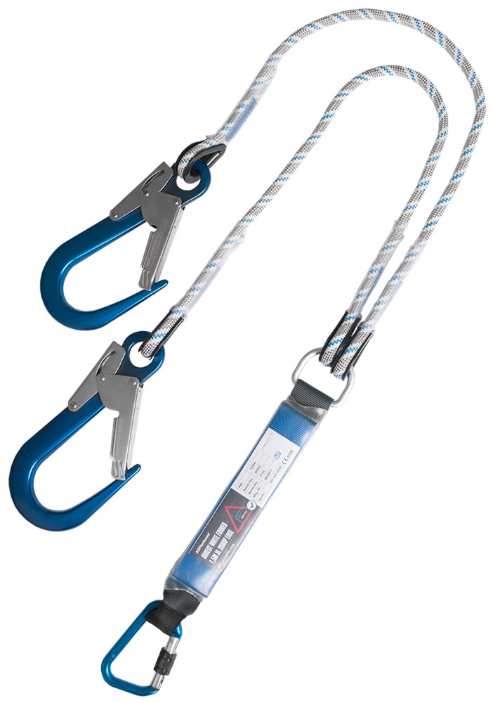 Gevorkte vanglijn met valdemper en kernmantellijn van 12 mm, bestendig tegen scherpe randen. Voorzien van een aluminium karabijnhaak met schroefsluiting en twee aluminium steigerhaken. Biedt 100% veiligheid als de gebruiker zich moet voortbewegen van ankerpunt naar ankerpunt.
