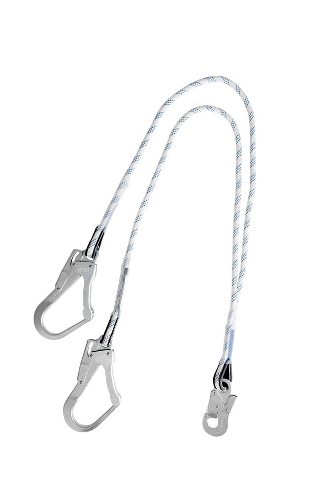 12 mm, 1,5 m lang kernmantellijn met krimpkousen. Stalen Snap hook aan de ene kant en twee blauwe aluminium steigerhaken aan de andere kant. De twee steigerhaken bieden 100% veiligheid als de gebruiker zich moet voortbewegen van ankerpunt naar ankerpunt.