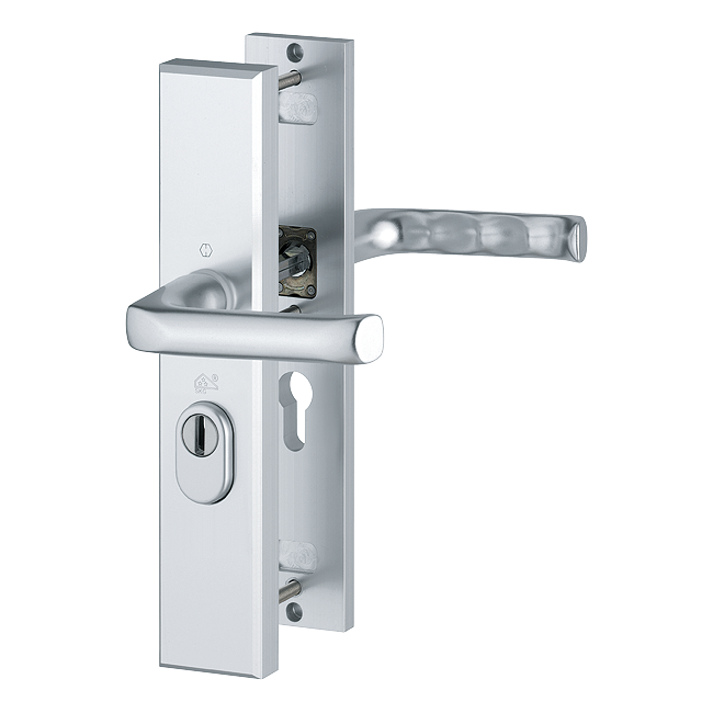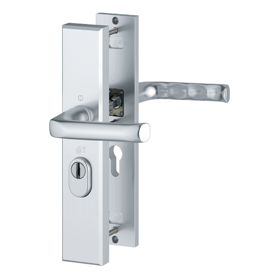 HOPPE rechthoekig inbraakwerend deurkrukgarnituur van massief aluminium, met rondom facet, conform DIN 18257 en NEN 5089, SKG®***-keurmerk. Buitenzijde met cilinder-kerntrekbeveiliging en stalen nokken, deurkruk met HOPPE-profielstift. Binnenzijde voorzien van hooghoudveer en met zichtbare bevestiging met 3 x M6 kruiskop Bouten en deurkruk-gatdeel.