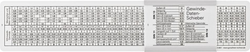 • Met tabellen aan voor- en achterzijde voor metrisch normaal ISO-draad (DIN 1502, oude DIN 13), Whitworth-draad (DIN 11), Whitworth-gasdraad (DIN 259)
