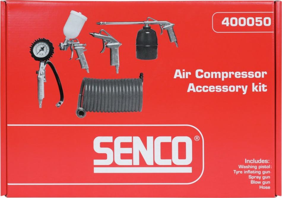 De Senco persluchtset bestaat uit de volgende onderdelen: Verfspuitpistool, Vloeistofspuit, Bandenventiel met manometer, Blaaspistool en Spiraalslang