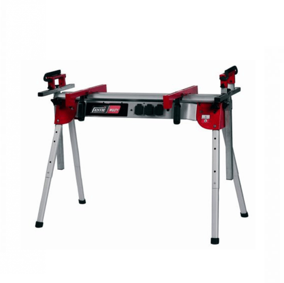 Universeel onderstel voor afkort- verstekzaag. Zeer stabiel aluminium onderstel. Poten zijn telescopisch in hoogte verstelbaar. 3 geintegreerde contactdozen. Geintegreerd handvat voor gemakkelijk transport. Zijsteunen in hoogte en breedte verstelbaar.