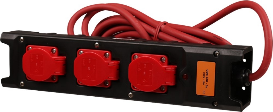 Nylon, 2-polig Schuko stekker met beschermingscontact. Geschikt voor 230 V. Geadviseerd wordt een maximum van 10 A bij 1,0-1,5 mm² en bij 16 A minimaal 2,5 mm². Met neopreen kabel H07 RN-F. Voorzien van 3 contactdozen met klapdeksel met beschermingscontact, IP 44.