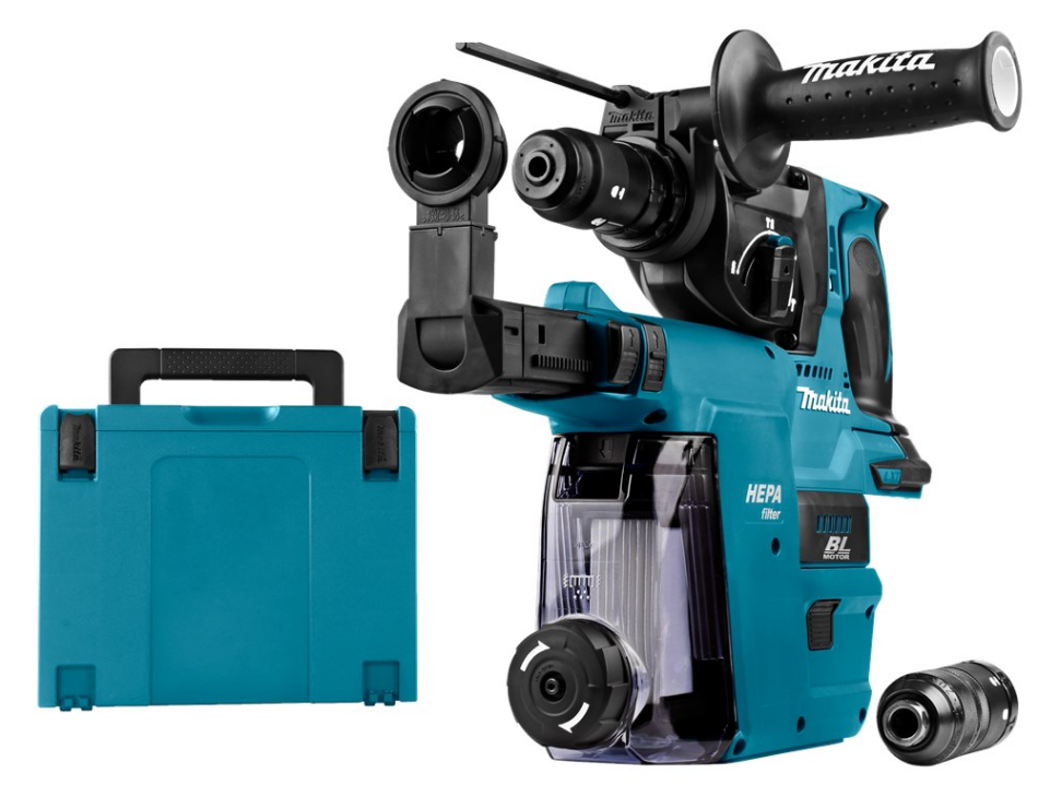 Uitgerust met twee verwisselbare boorkoppen: een SDS-PLUS en snelspanboorkop.