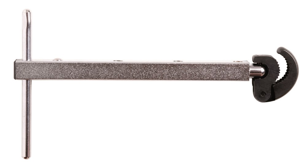 Afvoersleutel met een verende kop en flexibele klem aan bovenzijde voor optimaal gebruik in moeilijk toegankelijk ruimtes